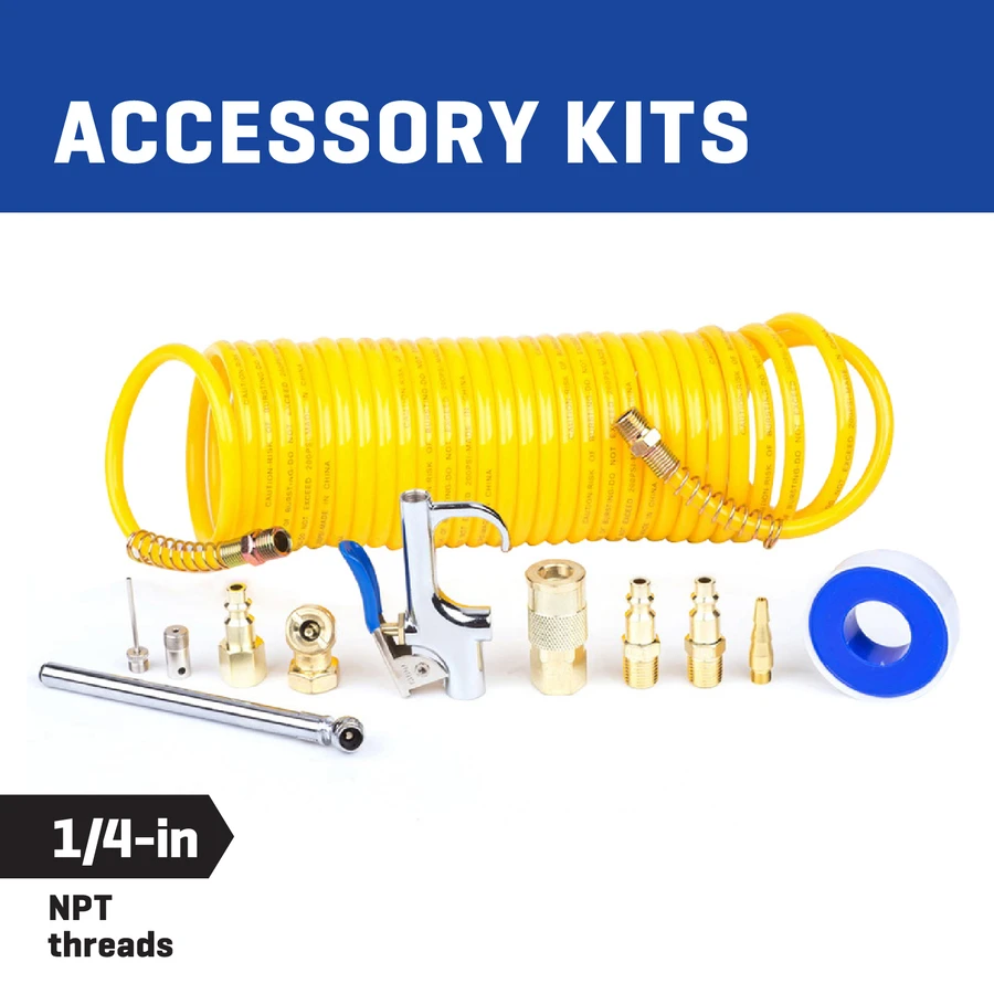 | Package Contents | Sports ball needle, blow gun, pencil tire gauge, thread seal tape, coupler, 1/4-in female plug, two 1/4-in male plugs, tire inflator nozzle, 1/4-in x 25-ft coil air hose, safety nozzle, and screw on chuck |