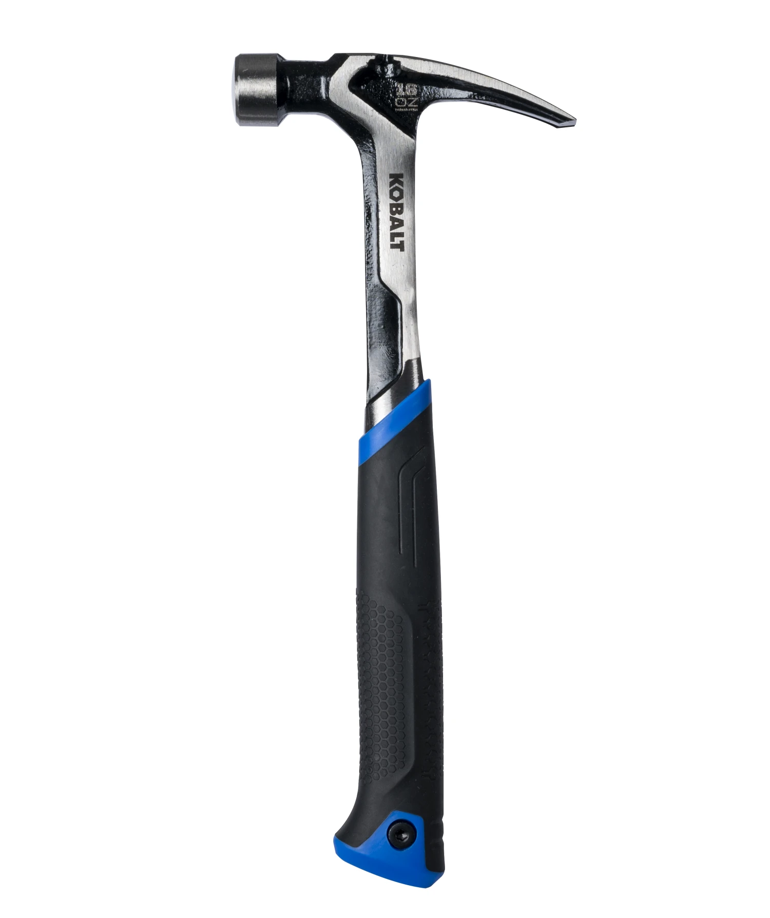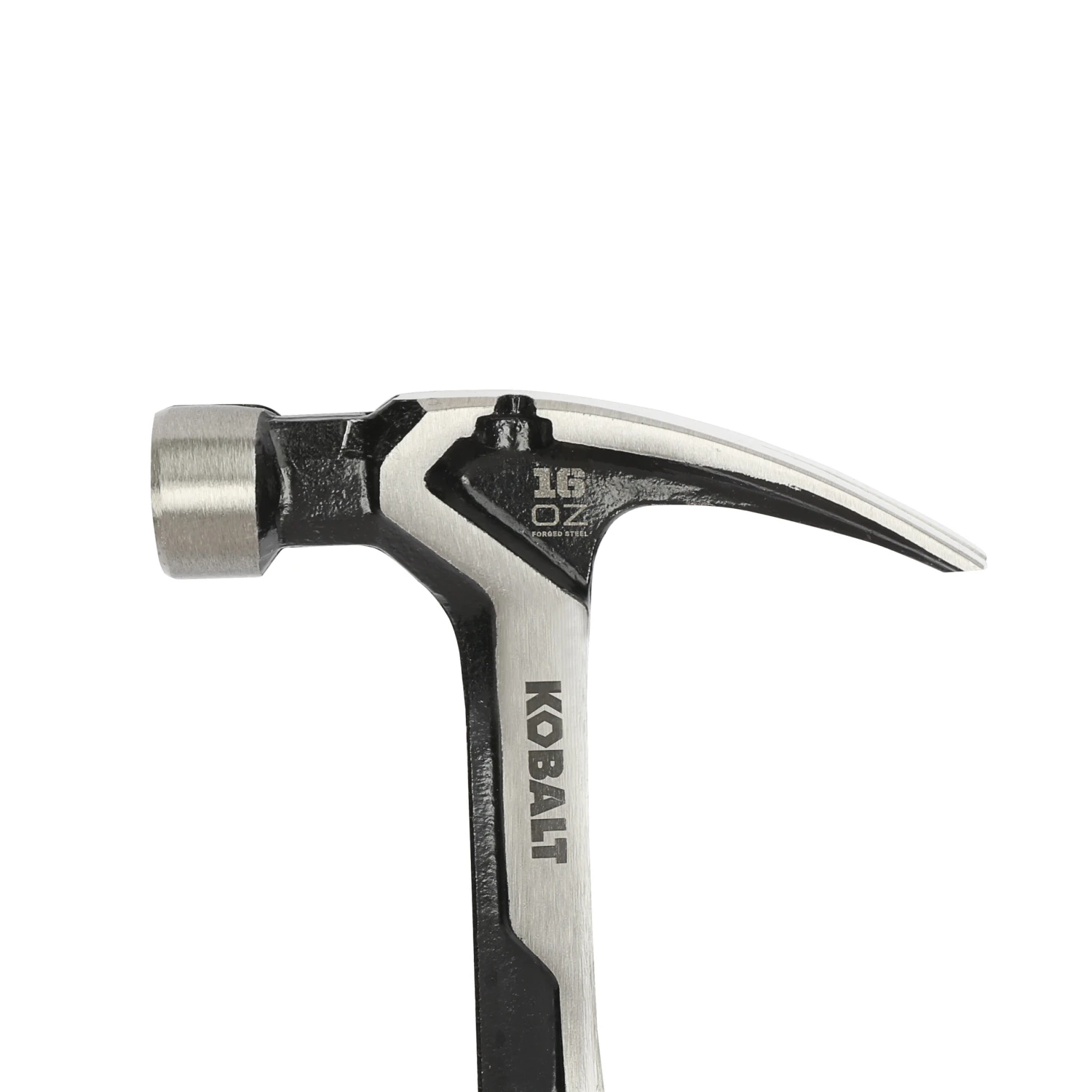 This smooth-faced tough 16-oz hammer by Kobalt is made of forged one-piece steel construction and bi-material slip-resistant handle. The rim temper reduces incidence of chipping or palling. It has a magnetic nail holder for hammering nails with one hand and a notched side nail puller. This product is covered by a limited lifetime warranty.