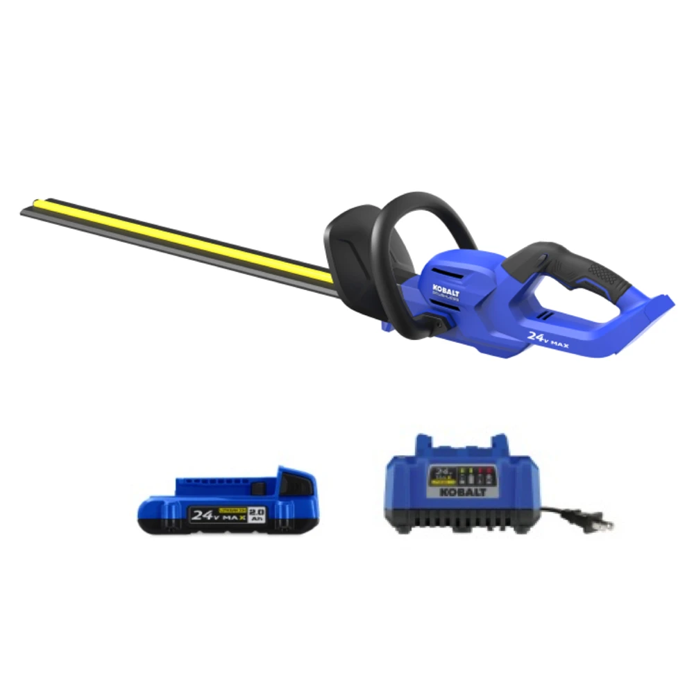 - The hedge trimmer is compatible with all Kobalt’s 24 V max batteries and chargers (others sold separately)