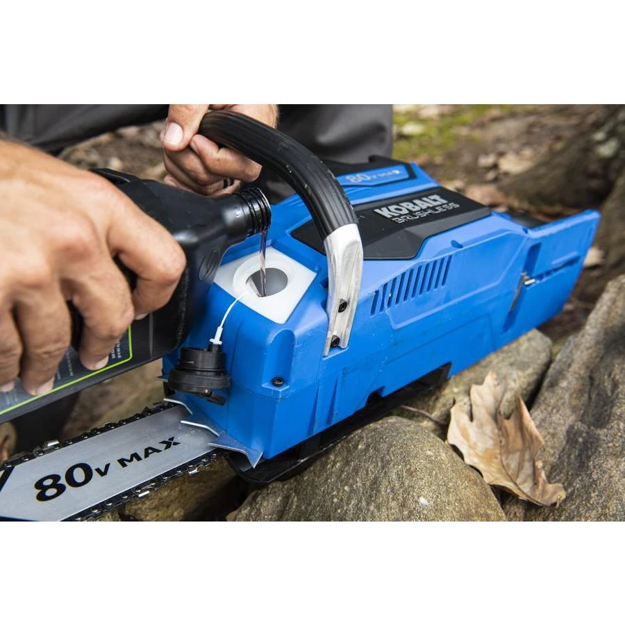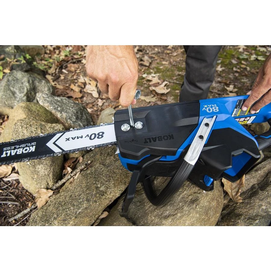 Powered by one of the industries highest voltage batteries to provide ultimate performance, Kobalt/s cordless chainsaw can work through 150 cuts of 4-in x 4-in pressure treated lumber on a single charge. High performance brushless motor keeps out debris, provides full power during tougher cuts and ensure longer lifespan. Electronic chain brake adds user safety, and handle with protective metal wrapping makes for a more durable tool. The 80 Volt 2.5-amp-hour battery fully charges in only 45 minutes so you can quickly get back to work. Auto-oiler with oil view window helps maintain bar and chain life, while indicating exactly when new oil is needed.